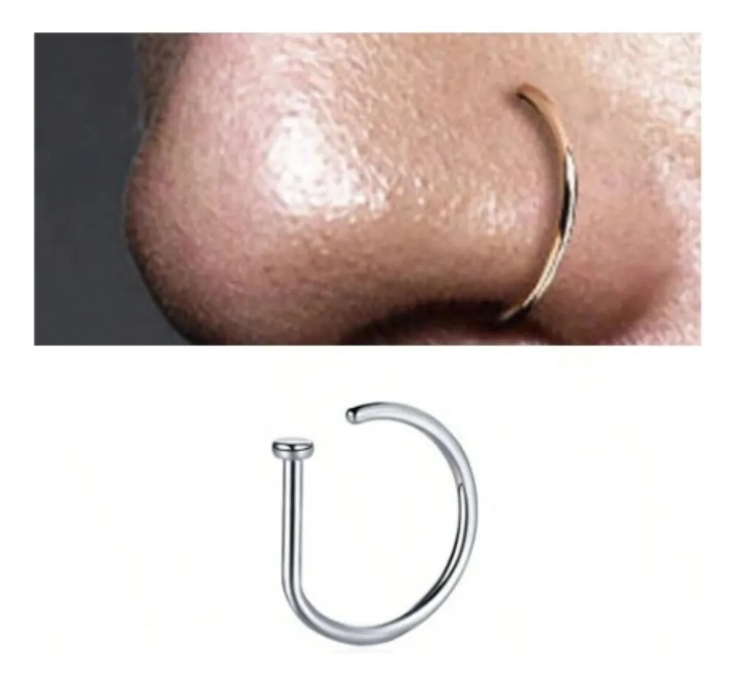 1 Pieza Aro Piercing Sin Perforación Para nariz, y no necesita perforación puesto que es a presión. Descripción Color: Plateado Tipo: Pendiente Falso Piercing para Nariz Magnético: No Género: Mujer/Hombre Material: Acero Inoxidable Diámetro 8 mm Grosor 0,8 mm